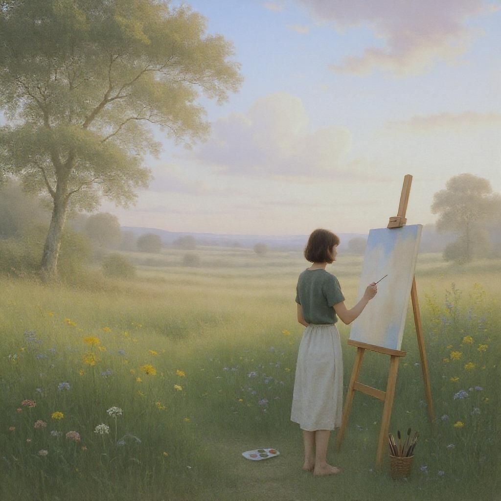 An artist stands nestled amidst a tranquil meadow, surrounded by wildflowers and gentle, rustling trees, as they diligently paint a canvas. The sky stretches wide overhead, a soft palette of pastel dawn hues filtering through scattered clouds. A wooden easel supports their work, while brushes and paints are scattered at their feet, partially hidden by tall grasses. The artist, focused and serene, captures the peaceful ambiance, their brushstrokes mirroring the delicate dance of light and shadow in the gentle breeze.