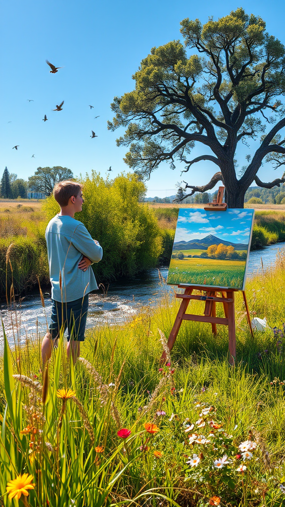 An artist stands peacefully among tall grasses and wildflowers, brush in hand, as they paint a vibrant landscape on a canvas set up by a gently flowing river under a clear blue sky, sunlight streaming through the leaves of a nearby oak tree, casting playful shadows, capturing the essence of nature's tranquility with every stroke, while birds sing softly in the background.