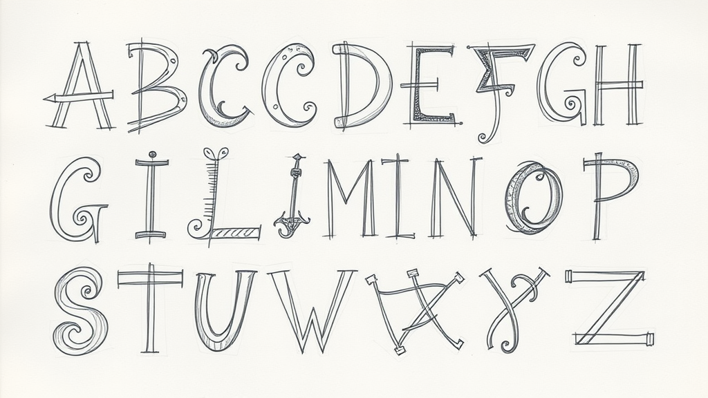 An artistic depiction of the alphabet sketched on paper, each letter uniquely stylized with creative flourishes and imaginative details.