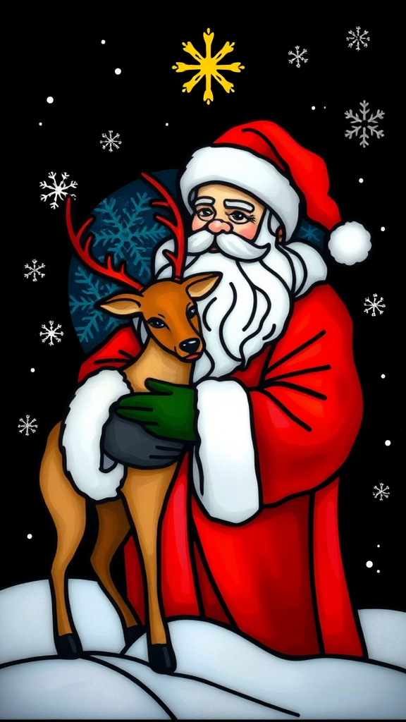 An artistic illustration featuring a gorgeous stained glass depiction of Santa with Rudolph, embodying a Christmas concept. The composition follows the golden ratio for perfection, using simplified bold lines to create a masterful piece. The background has a matte black tone that evokes a festive Christmas mood. The piece avoids realistic faces, 3D elements, side views, and intricate detailing, focusing on a flat yet striking visual. Creative elements introduce a serene winter night sky filled with stylized snowflakes, enhancing the holiday atmosphere while maintaining the core concept.