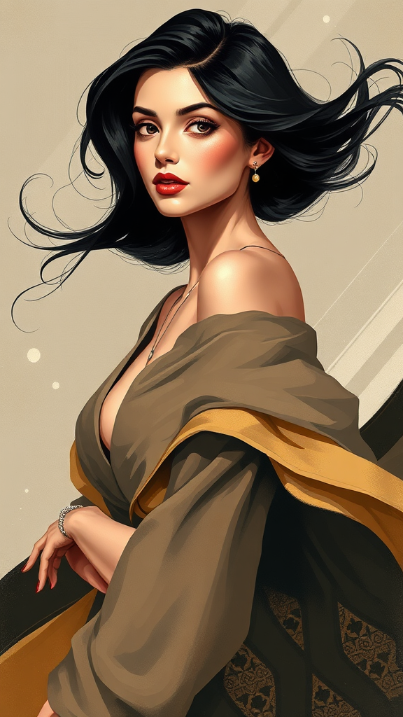 An artistic illustration of a sophisticated woman with jet-black hair, inspired by the style of Paul Kenton, showcasing confident elegance. Her flowing attire is depicted with bold, sweeping brushstrokes, blending a palette of muted, harmonious colors. The composition is dynamic yet exudes timeless beauty, capturing her confident gaze and poised demeanor, enveloped in an aura of refined sophistication. Subtle elements of Art Deco patterns enhance the scene, adding a hint of classic charm to the overall aesthetic.
