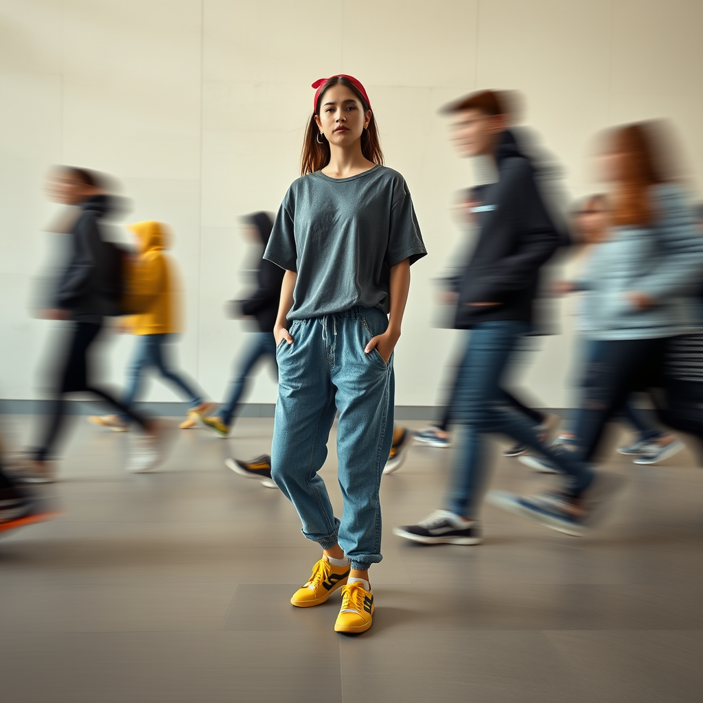 An artistic image captures the essence of urban hustle with a single focused female model standing still amidst a blurred motion of people walking past her, creating a dynamic sense of movement. The main model wears a grey loose-fit T-shirt paired with denim jogger pants and eye-catching yellow skateboard shoes. Surrounding her, the sub models are dressed in loose-fit hoodies and jogger pants with sneakers, accentuating the urban vibe. The image is shot using a Sony α9 II with a Sony FE 100-400mm f/4.5-5.6 GM OSS lens, in an open minimalistic space. The setting features soft, indirect lighting and a neutral color scheme, emphasizing the motion blur effect. The main subject is sharply in focus, providing a striking contrast against the transient, blurred figures around her, underscoring the theme of stillness amidst chaos. The background is a plain wall with subtle texture, ensuring the motion effect remains the focal point.