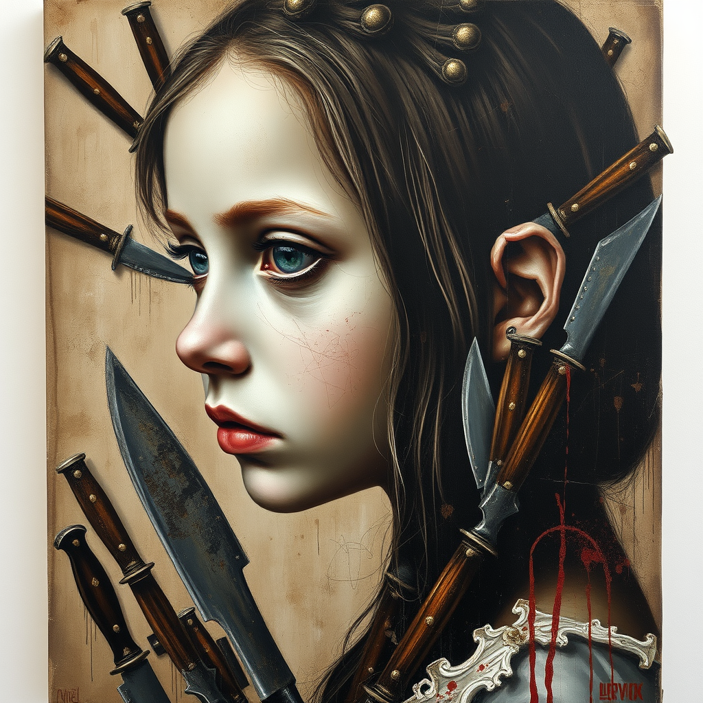 An artistic oil painting capturing a right-side portrait of a girl with hollow eyes and an intense gaze. The composition exhibits a grainy texture with a minimalist avant-garde approach, enriched with intricate detailing. The style draws inspiration from Diego Velazquez. The background and elements around her are suggestively infused with numerous knives, creating an intriguing contrast. The overall presentation remains raw and unrefined, maintaining a personalized touch with a unique blend of classic and modern artistry.
