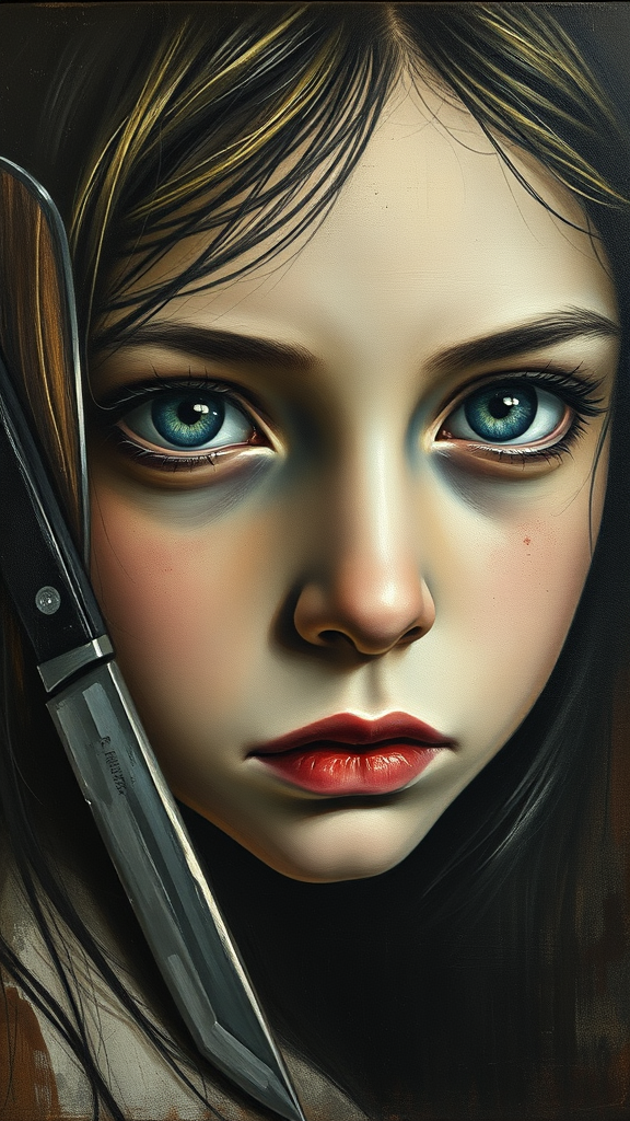 An artistic oil painting capturing the face of a young girl with hollow, enigmatic eyes. The portrait is imbued with a grainy texture and minimalist avant-garde style, showcasing rich detailing with numerous knives integrated into the composition. The piece exudes a rough, dark mood, maintaining a raw and unrefined aesthetic. The elongated 9:16 aspect ratio enhances the dramatic effect, emphasizing depth and intensity.