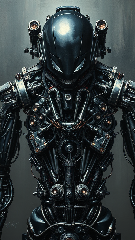 An artistic oil painting featuring the upper body of a bizarre mechanical humanoid, inspired by the sci-fi style of Tsutomu Nihei. This piece showcases a heavy brushed technique with a front-facing view. The humanoid has a haunting gaze, embodying a dystopian essence. The metallic body is black with chrome highlights, intricately detailed with ultra-realistic elements that emphasize the real paint texture. The design is strikingly horrible yet captivating, filled with numerous mechanical touches, evoking a sense of chaos and complexity. The canvas captures an elongated 9:16 aspect ratio, emphasizing a raw, stylized interpretation of dystopian art.