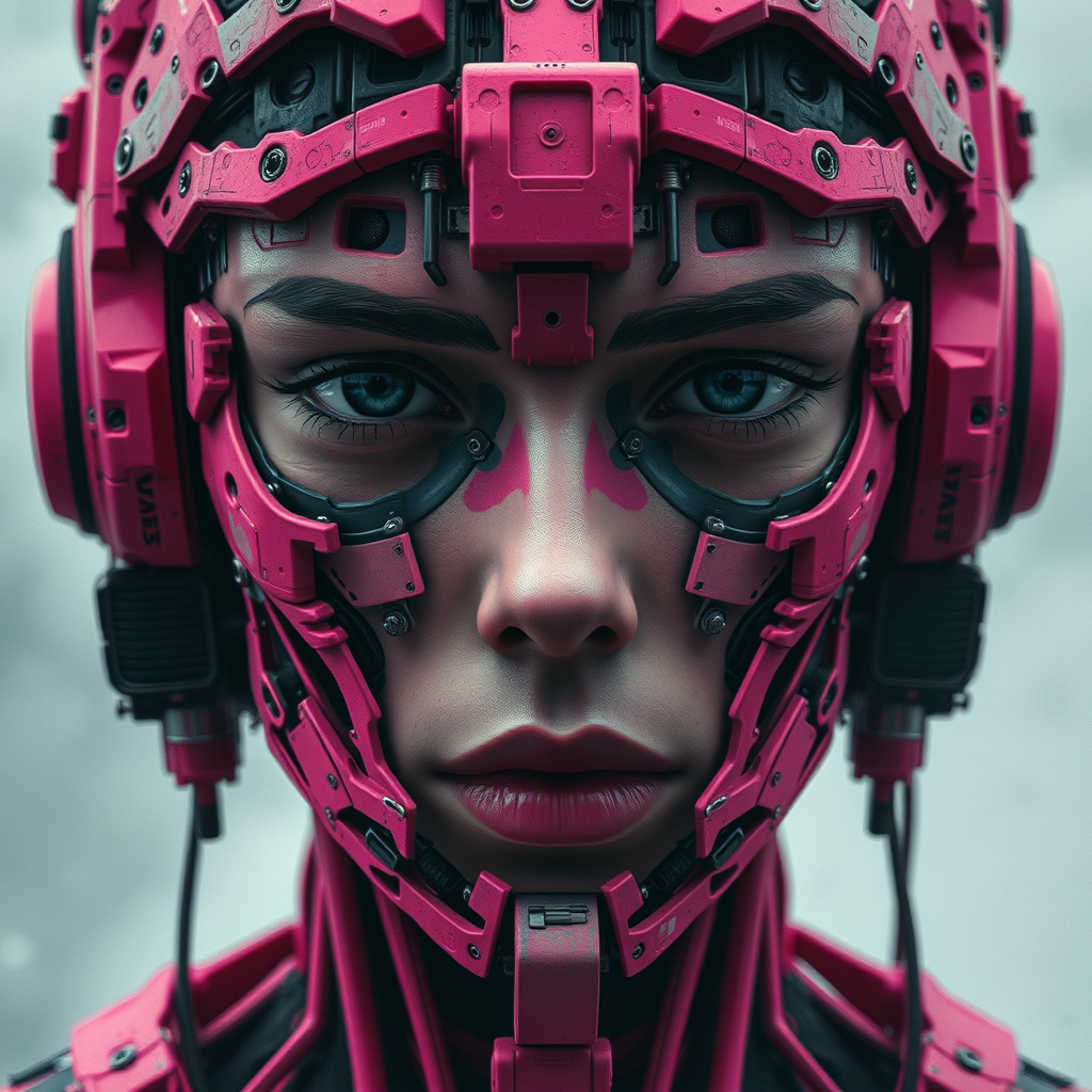 An artistic portrayal of a synthetic mechanic face with intricate, complex details, featuring a deep, penetrating gaze. The upper-body composition is dominated by a limited color palette, primarily deep hot pink interspersed with intense black, evoking a sense of a dystopian and cold atmosphere. Inspired by Tsutomu Nihei, the scene captures raw stylistic elements, with controlled chaos and a stylized intensity, embracing a 9:16 visual ratio.