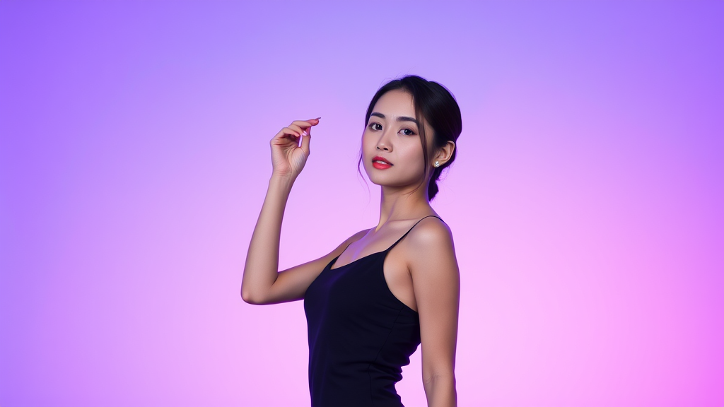 An Asian model gracefully positioned against a vibrant gradient of purple and blue hues, dressed in sleek black attire that complements the striking backdrop. The scene exudes a sense of modern elegance and style, with soft lighting enhancing the model's features and adding depth to the composition, set in a vertical orientation.