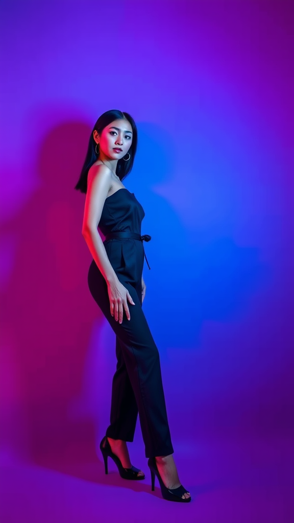 An Asian model posed gracefully against a vibrant purple and blue backdrop, dressed in elegant black attire, exuding an air of sophistication and modern style. The scene captures the interplay of colors and shadows, adding depth and intrigue to the composition, while the model's confident expression completes the captivating visual narrative.