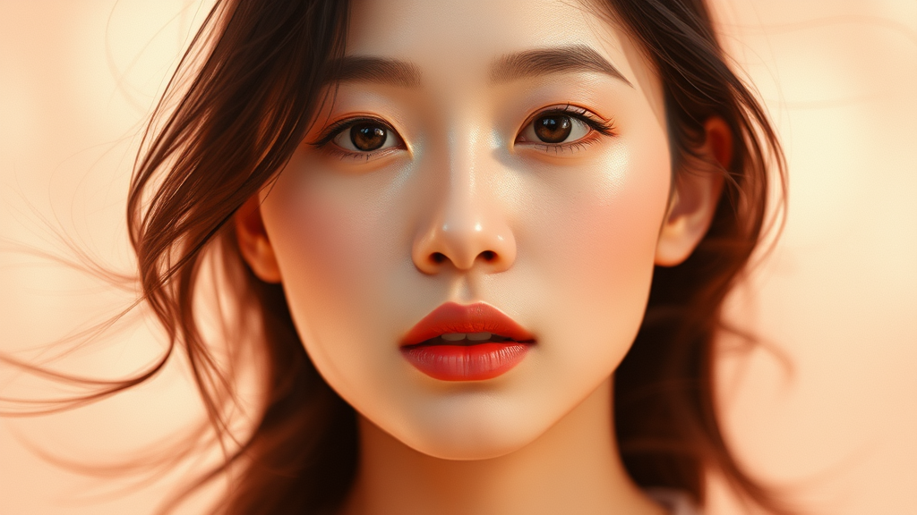 An Asian woman rendered in the style of soft amber and blush pink tones, featuring blurred imagery with a shiny, glossy finish. The scene evokes a melting, abstract aesthetic, reminiscent of drugcore art, combined with the fluid elegance of Georg Jensen design. The artwork employs wet-on-wet blending for seamless transitions, creating a fluid, dreamlike atmosphere.