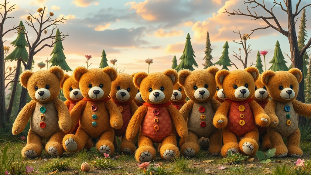 An assembly of teddy bears, courageously marching through a whimsical forest, each with their own unique patchwork and colorful buttons, a display of bravery and innocence, under a sky painted with the soft hues of dawn, as gentle creatures of imagination, optimism radiating from their stitched smiles and mismatched eyes, a heartwarming spectacle blending fantasy and heart.