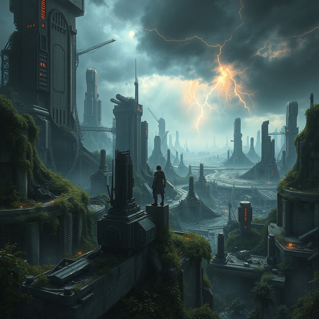 an astonishing dystopian scene with a cinematic and epic atmosphere, depicting a sprawling futuristic city in ruins, towering skyscrapers entangled in overgrown vegetation, dark stormy skies with flashes of vivid lightning, remnants of advanced technology scattered amidst the debris, a lone figure in tattered attire standing atop a building, surveying the desolate landscape, hints of past glory contrasted with present decay, an eerie yet mesmerizing blend of chaos and beauty