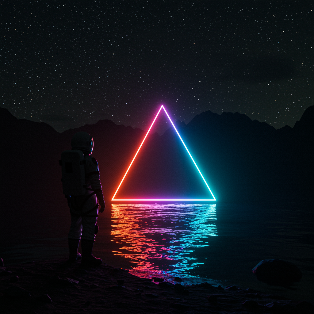 An astronaut clad in a reflective spacesuit stands on the tranquil shore of a lake under a starlit sky. The scene is captured in stunning detail using the Fujifilm X-T3. Nearby, a large, luminous neon triangle casts a surreal glow, its vibrant colors dancing across the water's surface. The night is alive with the radiance of this geometric figure, enhanced by ray tracing techniques. The image is rendered in 8k UHD with HDR, capturing the sharp contrast between the soft glow of the neon and the deep shadows enveloping the surrounding landscape. The astronaut gazes at the neon shape, a reflection both in the water and within the mirrored visor of the helmet, creating an otherworldly fusion of technology and nature.