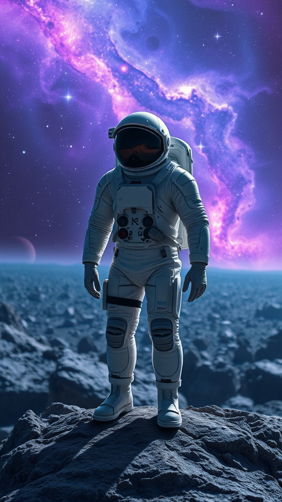 An astronaut, clad in a sleek, futuristic space suit, stands with a sense of wonder on the jagged surface of an asteroid. The vast expanse of an asteroid field stretches out before them, each celestial body glinting with a different hue against the backdrop of the endless cosmos. Nebulas in vibrant shades of purple and blue swirl in the distance, casting an ethereal glow that illuminates the scene with a surreal beauty. Stars twinkle softly in the void, adding depth to the endless night. The detailed textures of the asteroid's rocky terrain contrast with the pristine smoothness of the astronaut's armor, highlighting the blending of man and the universe. This high-resolution, sci-fi masterpiece captures the awe-inspiring atmosphere of space exploration and discovery.