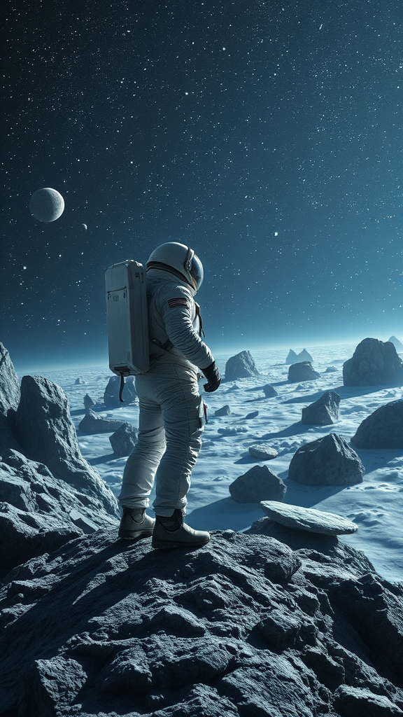 An astronaut clad in a sleek space suit stands confidently on the rugged surface of an asteroid, gazing out across a mesmerizing asteroid field that stretches into the vastness of space. The scene is a masterpiece of sci-fi artistry, with a breathtaking and atmospheric backdrop that highlights the intricate details of each celestial body. The vastness of space is filled with a myriad of stars twinkling in the distance, casting ethereal glows on the asteroids. The astronaut's visor reflects the celestial beauty, capturing the essence of wonder and exploration. The image is rendered in stunning 4k resolution, offering a hyper-realistic and highly detailed representation of a galaxy teeming with mystery and adventure. The scene evokes an overwhelming sense of solitude and discovery, inviting the viewer to imagine the endless possibilities of the universe.