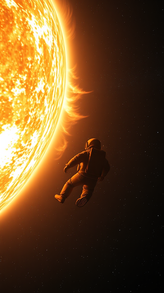 An astronaut floats in the vast expanse of space, captivated by a breathtaking coronal mass ejection erupting from the sun's surface, vivid plumes of fiery plasma casting an ethereal glow across the cosmos. The stars twinkle in the endless dark void, creating a stunning cinematic contrast. Rendered in stunning 8k resolution with an unreal engine feel, the scene captures the awe-inspiring power and beauty of the universe in dramatic detail, set in an expansive 16:9 ratio for a truly immersive experience.