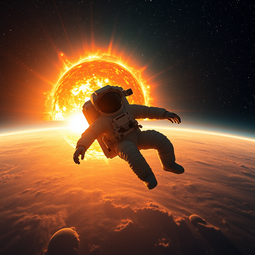 An astronaut floats in the vast expanse of space, mesmerized by the breathtaking spectacle of a coronal mass ejection erupting from the sun. The fiery glow illuminates the surrounding stars, casting a cinematic aura over the scene. The vibrant colors and intricate details are rendered in stunning 8k quality, as if crafted in Unreal Engine. The sun's radiant energy creates an awe-inspiring contrast against the dark, star-speckled void, highlighting the delicate balance between chaos and beauty in the universe.