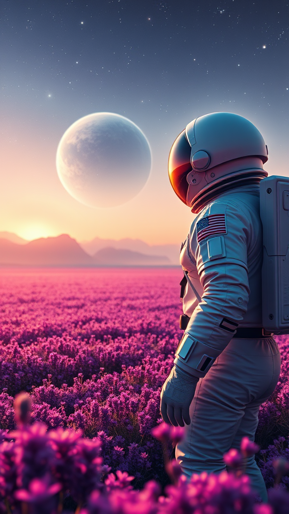An astronaut gazes across an expansive violet meadow, surrounded by a stunning alien landscape, capturing the essence of sci-fi atmospheric photography. The scene is intricately detailed and hyperrealistic, presented in ultra-high-definition 4k resolution. Ethereal colors dance across the horizon as a distant planet looms large in the sky, enhancing the otherworldly beauty of the vista. The meadow's vibrant hues contrast with the sleek, reflective surface of the astronaut’s suit, creating a captivating masterpiece that invites viewers into a surreal, dreamlike world.