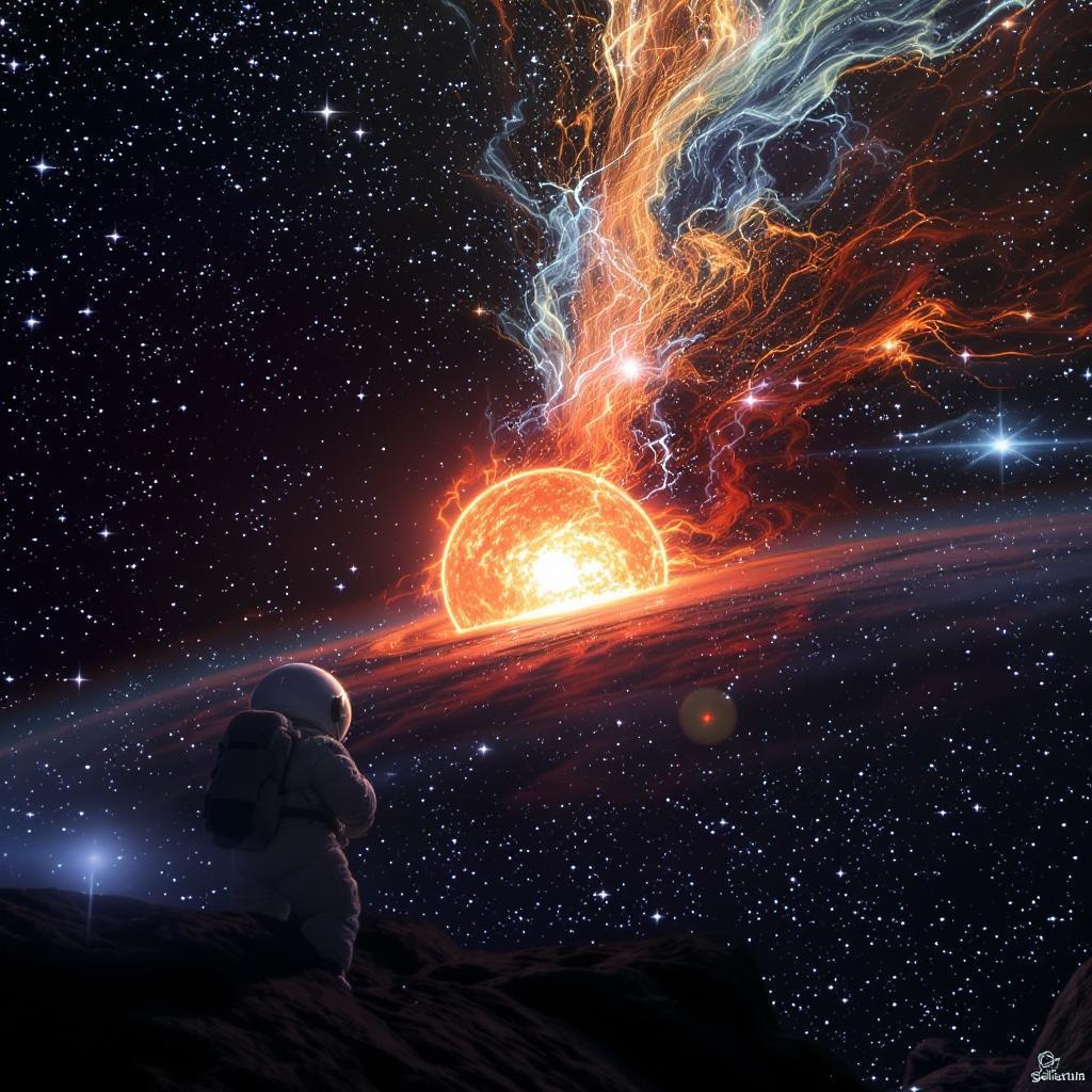 An astronaut gazes in awe at a coronal mass ejection erupting from the Sun, surrounded by the vastness of space and twinkling stars. The scene is vivid and cinematic, as if captured in 8k resolution using the stunning capabilities of an advanced graphics engine. The brilliant solar flares dance with colors against the dark cosmic backdrop, creating a breathtaking contrast and a sense of wonder and insignificance in the infinite universe.