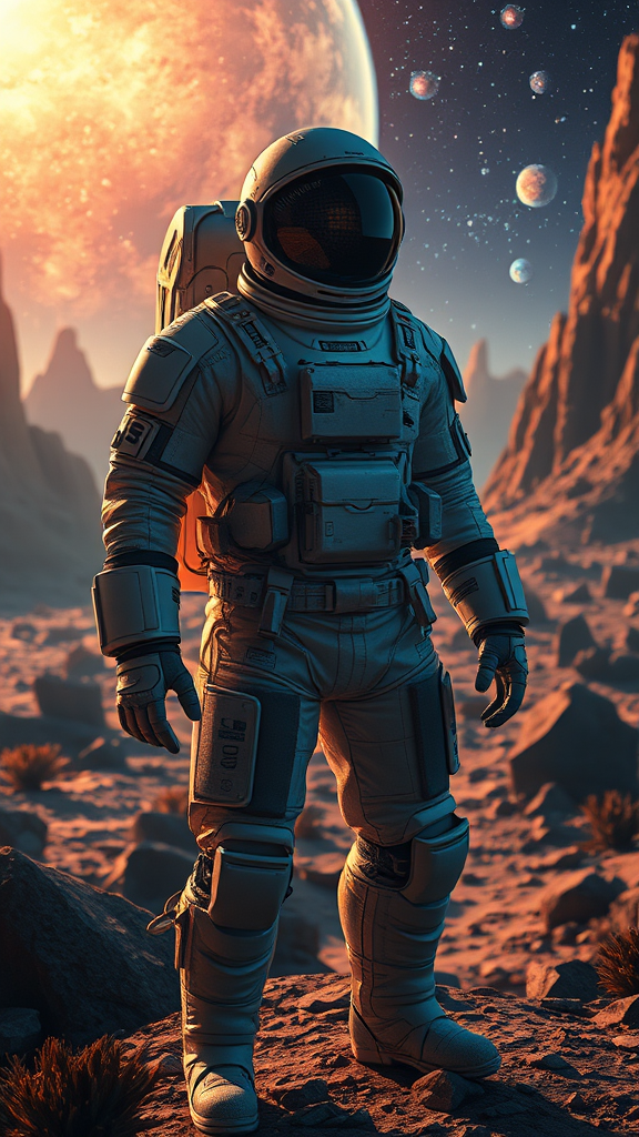 An astronaut in a futuristic spacesuit stands heroically amidst a surreal fantasy landscape, blending elements of epic fantasy and cutting-edge technology. The scene is illuminated with dramatic, studio-quality lighting, casting long shadows that contrast against the glowing celestial backdrop. Satellite imagery textures the terrain, adding depth and realism to the ultrarealistic environment. The astronaut's visor reflects distant galaxies, while the scene is captured in breathtaking 8k resolution, emphasizing every detail of this captivating, futuristic odyssey.