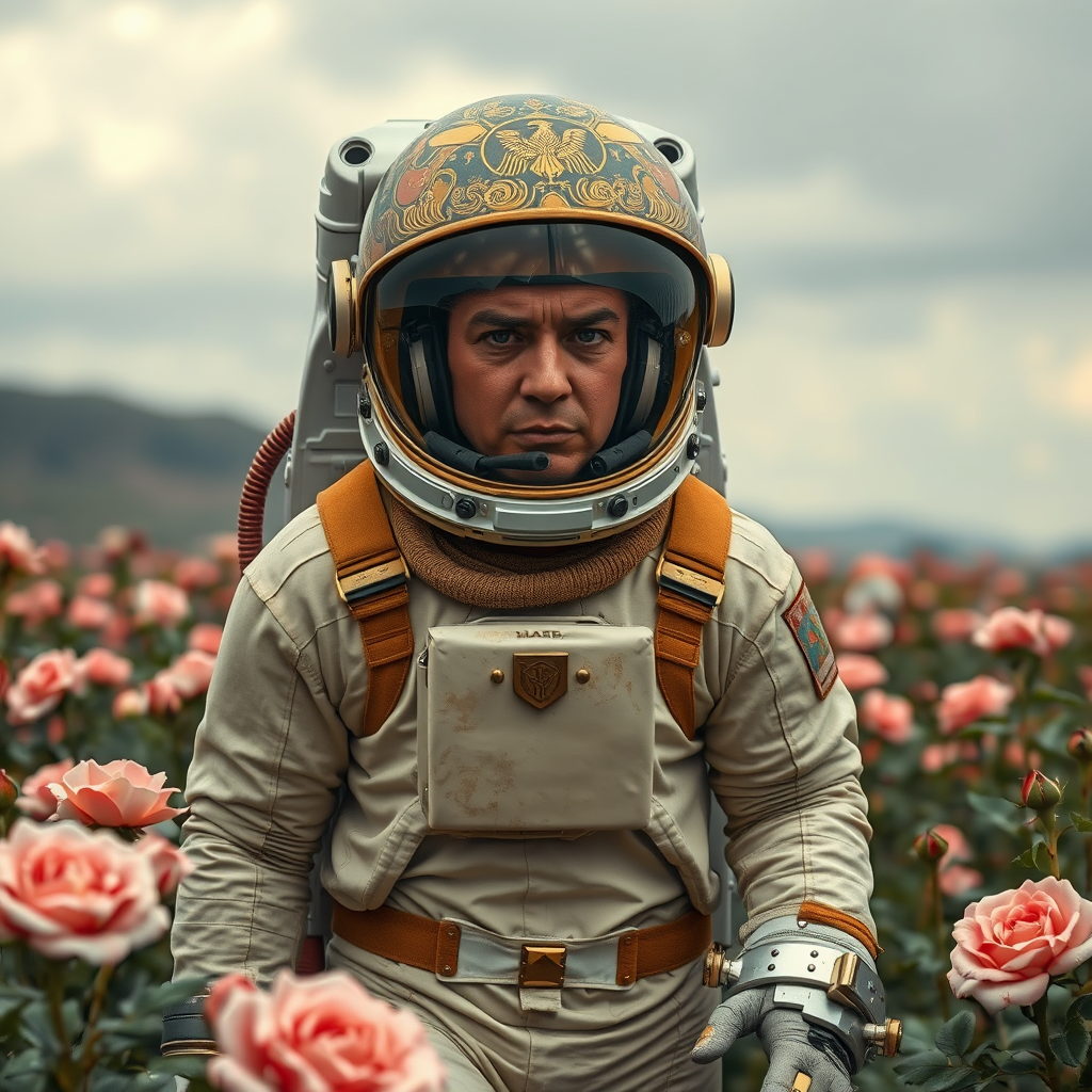 An astronaut in a helmet with intricate artwork walks confidently across a landscape of blooming roses, showcasing full-body attire with a militaristic, realistic touch. The scene is captured in high-definition, with a palette of dark gold, emphasizing distinctive facial features, especially prominent noses. The vertical composition enhances the surreal contrast between technology and nature.