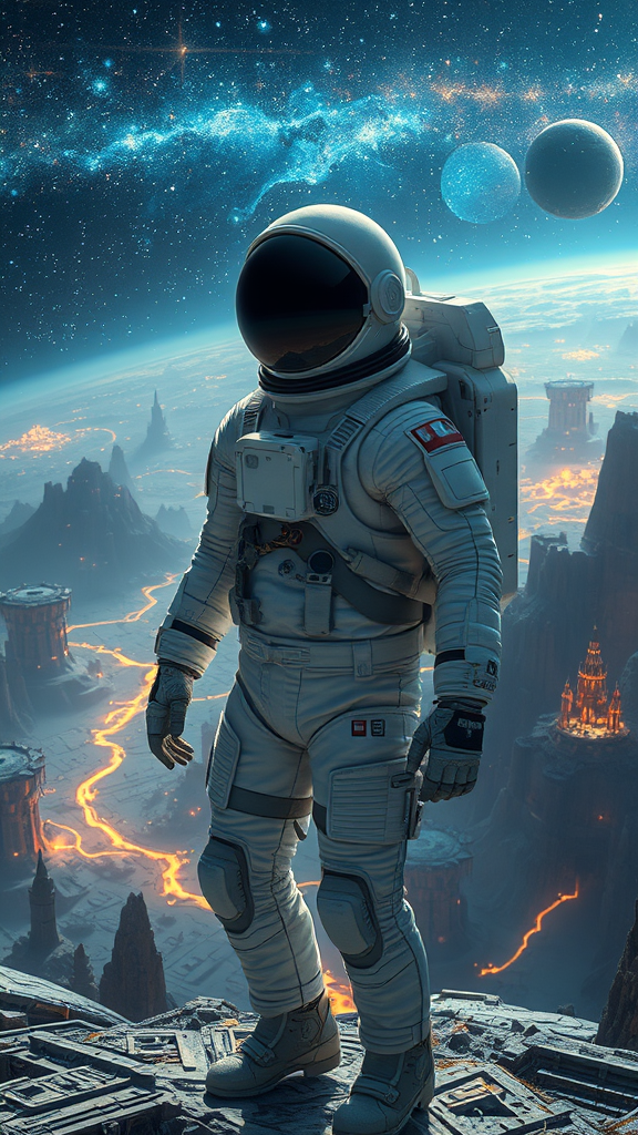 An astronaut in a state-of-the-art spacesuit stands amid a breathtaking cosmic fantasy landscape, surrounded by epic fantasy elements like distant celestial kingdoms and mythical star creatures, bathed in ethereal, otherworldly light. Satellite imagery reveals intricate, futuristic landscapes with towering structures and glowing rivers of light beneath a vast starry expanse. The scene is captured with ultrarealistic detail, utilizing studio-grade lighting to highlight the intricate textures of the spacesuit and the vibrant colors of the celestial environment, presented in stunning 8k resolution.