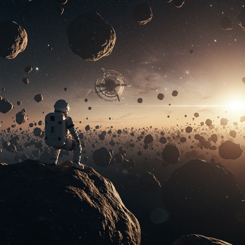 An astronaut perched on a rugged asteroid gazes out over a vast, mesmerizing asteroid field, the scene crafted in a masterpiece of sci-fi atmospherics with intricate and highly detailed elements, captured in stunning 4k resolution. The infinite expanse of space twinkles with distant stars, while the shadows of rotating asteroids create a dance of light and dark across the astronaut's reflective helmet visor. A faint cosmic glow envelops the scene, adding depth and intensity to this otherworldly vista.