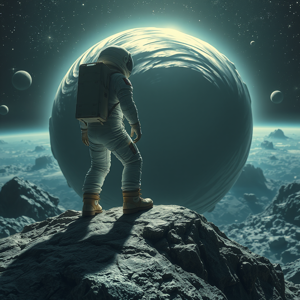 An astronaut stands atop a rugged asteroid, gazing out at an expanse of swirling asteroids, the scene captured in a breathtaking sci-fi masterpiece. The vastness of space serves as a backdrop, dotted with distant nebulae and twinkling stars. Every detail is meticulously rendered, from the textured surface of the asteroid beneath the astronaut's boots to the shimmering reflections on the visor of the space helmet. The atmospheric aura adds depth and mystery, creating a stunning 4k visual spectacle that draws the viewer into an otherworldly adventure.