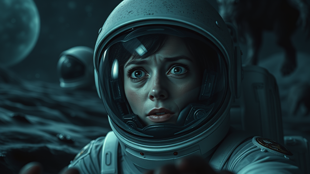An astronaut stares wide-eyed through her helmet, terror etched across her face as a looming creature gives chase. The alien planet around her is shrouded in darkness, its surface slick and glistening with moisture, every detail eerily realistic. The air is thick with tension, the faint glow of distant stars offering little comfort against the unknown threats lurking in the shadows.