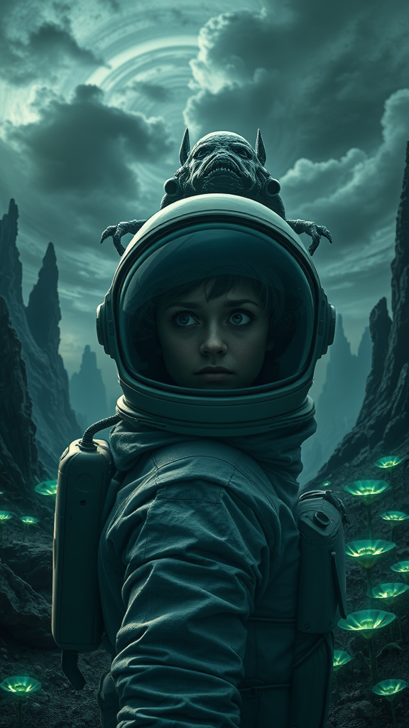 An astronaut stares wide-eyed through the visor of her helmet, her face a mask of terror as she backs away from a looming creature emerging from the depths of the shadowy, damp alien landscape. The surrounding terrain is harsh and foreboding, with jagged, towering rock formations silhouetted against a sky swirling with ominous, dark clouds. Strange bioluminescent plants cast an eerie glow across the scene, adding a surreal touch to the oppressive darkness. Her breathing echoes inside her helmet, a stark reminder of her vulnerability as the alien creature moves with a predatory grace, its eyes locking onto hers with a chilling intelligence.