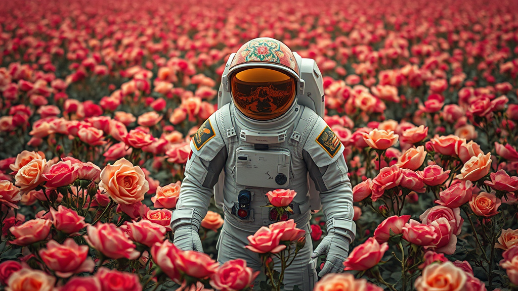 An astronaut with a helmet intricately painted, walking upon a vast field of blooming roses, their vibrant petals creating a surreal carpet of colors. The figure is depicted in full body, showcasing a militaristic realism with fine details accentuating their suit. The scene is rendered in high definition with a dark gold hue, capturing the distinctive and prominent noses of the figure. The atmosphere is both surreal and majestic, blending elements of nature and technology in a seamless harmony. The aspect ratio is tall and elegant, capturing the awe-inspiring journey amidst the blooming landscape.