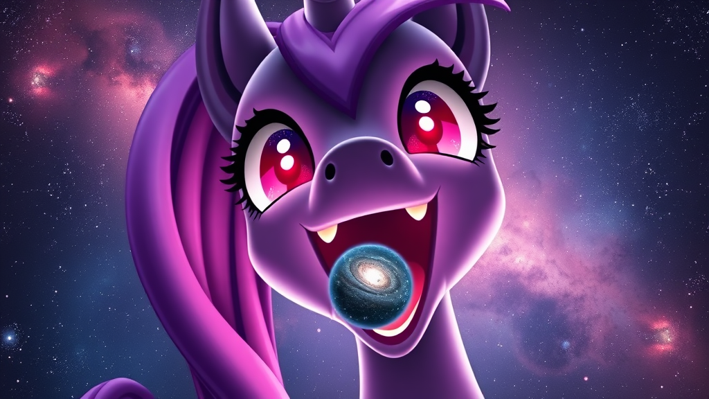 An astronomical Twilight Sparkle from My Little Pony, her form stretching across the cosmos, immensely larger than a galaxy, suspended in the vastness of space. A tiny galaxy hovers just before her colossal, open mouth. The perspective is an extreme close-up, capturing the awe of her radiant, red-glowing eyes as she prepares to consume the galaxy. Her expression is a fusion of wonder and cosmic power, with each strand of her mane shimmering like a nebula. The scene is a stunning, hyper-realistic depiction of celestial proportions, where fantasy and the infinite universe collide.
