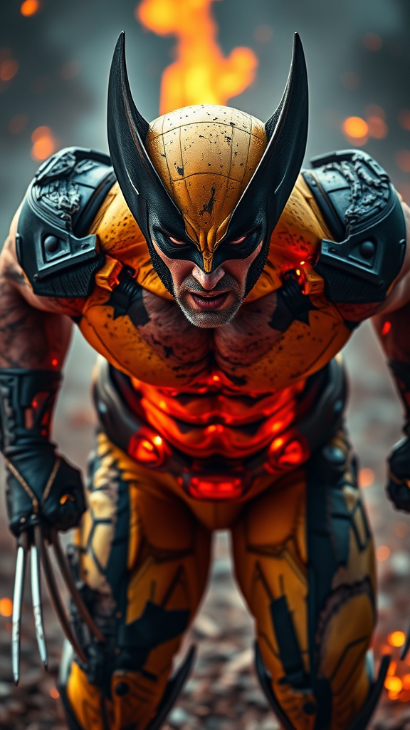 An attention-grabbing image of Wolverine showcasing his regenerative powers in action, featuring a full body shot of an extremely damaged Logan advancing toward the viewer. He emerges from the ashes with wounds visibly healing, captured in a dynamic and surreal style that highlights the extraordinary nature of his abilities. The scene illustrates his resilience and power, embodying a sense of rebirth and invincibility as he recovers from severe injuries. The focus is on his determined expression and the dramatic reconstruction of his injuries, emphasizing the awe-inspiring aspect of his mutant prowess.