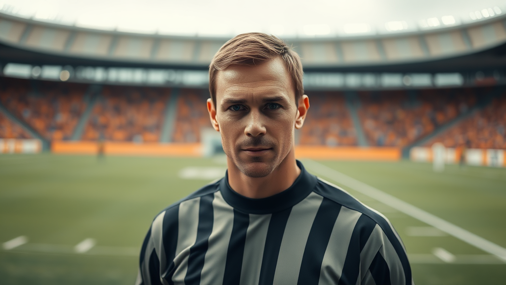 An attractive football referee stands centered on a football field, gazing directly at the viewer. The portrait captures a realistic, photo-realistic image with detailed skin textures, photographed in 8k quality. The scene is full length with high detail and RAW color art, enhanced by diffused soft lighting. A shallow depth of field and sharp focus contribute to the hyperrealism, with cinematic CGI lighting. The background subtly blurs to emphasize the subject, avoiding low-quality elements like jpeg artifacts and unrealistic features. The image maintains authenticity, avoiding errors in anatomy and proportions for a coherent, lifelike representation.