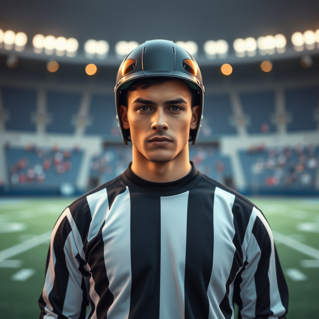An attractive individual, dressed as a football referee, stands centered on a football field, looking directly at the viewer. It's a portrait-style, highly detailed, photo-realistic image with a full-length frame. The scene captures the subject with diffused soft lighting and a shallow depth of field, emphasizing sharp focus and hyper-realism. Cinematic lighting creates a CGI-like 3D effect in 8k quality, enhancing the image with high detail and vibrant color. The background is subtly blurred to draw attention to the main subject.
