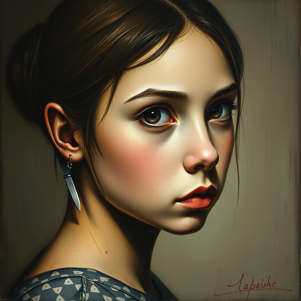 An avant-garde oil painting featuring a portrait of a girl with a rightward composition. Her eyes are vacant, drawing the viewer into their depths. The artwork possesses a grainy texture and minimalist yet richly detailed design, channeling the style of Diego Velazquez. Knives are subtly integrated into the background, adding an edge of roughness and intrigue. The overall mood is raw, with a personalized touch that brings out the girl’s enigmatic gaze.