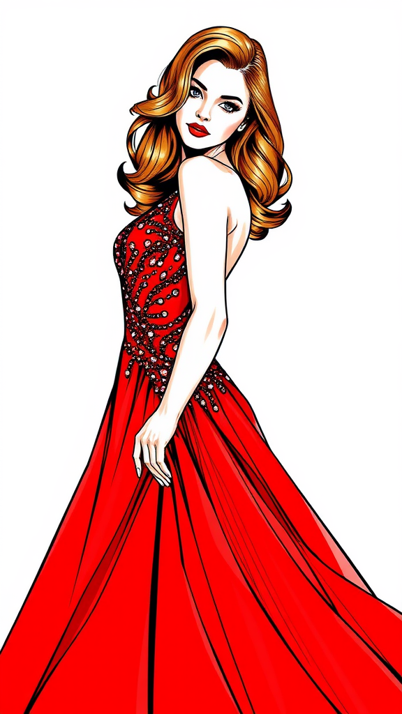 An award-winning fashion illustration of a striking woman in a dazzling red gown, designed in a coloring book style. The dress is a vivid and electrifying shade of crimson, drawing every eye in the room. With an air of grace and elegance, she exudes an aura of confidence and sophistication. Her hair cascades in soft waves that beautifully outline her face, accompanied by a splash of red lipstick that harmonizes with her ensemble. Captured in a full-body pose, the illustration accentuates the exquisite details of the gown and her poised stance, inviting admiration and wonder.