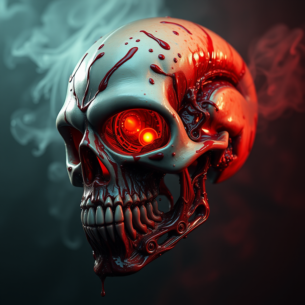 An award-winning image of a hyperrealistic alien skull drenched in glistening blood and corrosive acid, rendered in 8k with octane precision, dramatic cinematic lighting highlighting intricate details, trending on ArtStation, in the style of Giger, showcasing a hauntingly beautiful fusion of bone and biomechanical elements, atmospheric mist swirling around, eerie glow emanating from within, --ar 3:2.