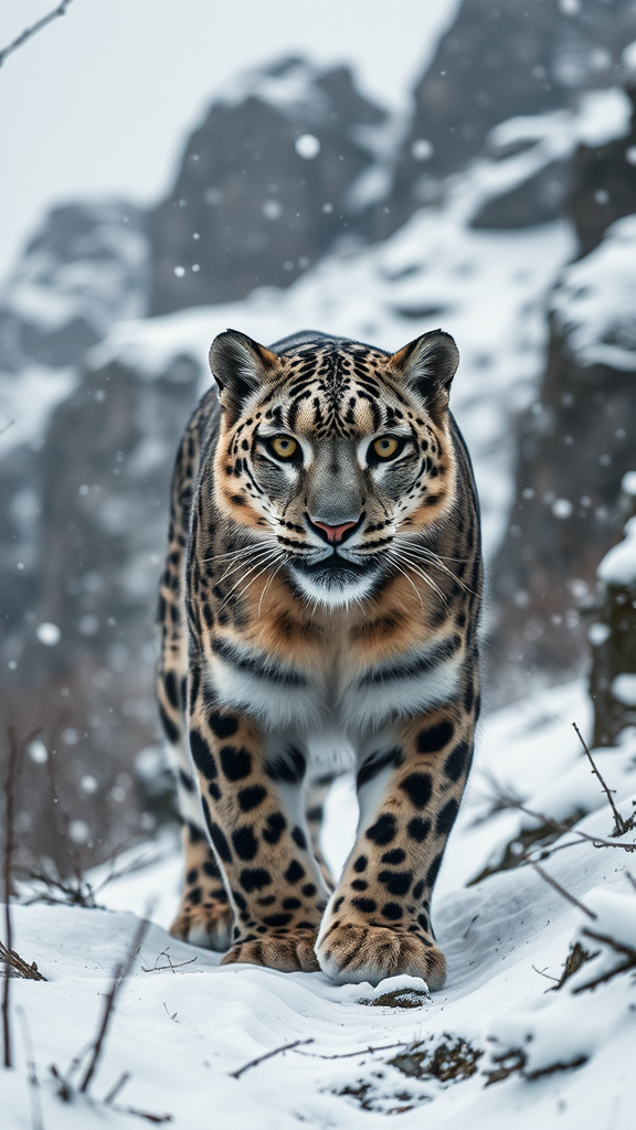 An award-winning National Geographic-style wildlife photograph featuring a snow leopard in mid-stalk within a snowy, rocky mountain forest on an overcast winter day. The full-body view reveals intricate details in high resolution, as the leopard locks its intense gaze onto the viewer, exuding a predatory presence. Its hyper-detailed eyes and crisp focus enhance the natural lighting, giving a vivid sense of its powerful presence amid the serene and rugged landscape. The scene is subtly animated by a gentle snowfall, adding an ethereal touch to the already dramatic composition.