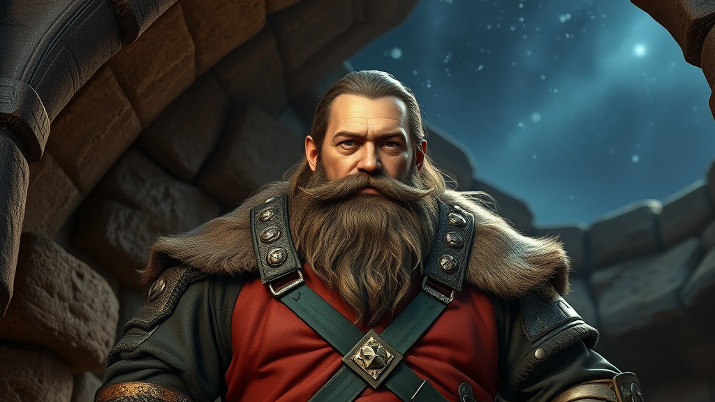 An award-winning portrait of a male dwarf from D&D, clad in leather and cloth armor, standing confidently in a stone cabin. He sports a full beard and exudes a fantasy ambiance, reminiscent of an RPG character. The scene is set in a medieval, colorful, and realistic style, under the night sky. The character embodies the essence of a D&D or Pathfinder hero, with inspirations from Ralph Horsley's art and LOTR game design fanart. The portrait would be suitable for concept art on platforms like ArtStation and DeviantArt. Rendered with global illumination and ray tracing, the scene glows with a vibrant aura, appearing as a high-definition 3D piece in Unreal Engine 5. The composition is balanced with careful attention to anatomy, proportions, and detail, capturing the character's heroic visage and presence.