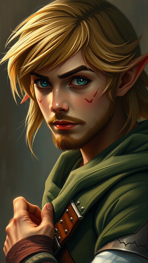 An award-winning poster featuring Link from The Legend of Zelda, depicted in a fantasy ambiance. The image showcases Link in a modelshoot style, rendered as a professional, majestic oil painting inspired by the works of Ed Blinkey, Atey Ghailan, Studio Ghibli, Jeremy Mann, Greg Manchess, and Antonio Moro. The artwork, trending on ArtStation and CGSociety, exudes an intricate, high-detail composition with sharp focus. It presents a dramatic, photorealistic depiction of Link, capturing his heroic essence. His facial features are distinct, with a touch of ruggedness, featuring subtle facial hair and a beard. The painting’s high resolution ensures clarity and depth, avoiding any artifacts or distortions. Creative modifications include a unique yet harmonious fusion of masculine and feminine elements in Link's portrayal, subtly enhancing his dynamic persona without deviating from the iconic character.