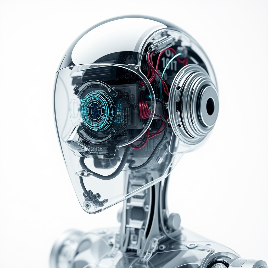 An award-winning transparent robot with a captivating concept design. The polycarbonate exterior reveals a complex network of circuit boards, wires, and electronics, creating a stunning visual of advanced technology. Set against a white background with reflections that highlight the sleek, glass-like appearance, the color palette plays with hues that complement the intricate interiors. The design is detailed and innovative, capturing the essence of cutting-edge mechanical concept art. The visual showcases an exploration of deformed elements, such as distorted iris and pupils, within the semi-realistic depiction. Although intended to be low quality and blurry, the monochrome and greyscale tones emphasize its unique aesthetic. The robotic design concept includes features like a recognizable nose and a slightly cropped frame to focus on its core mechanical beauty. Despite attributes like text or potential artifacts and signature cues, the visual remains a testament to visionary art and design in the realm of robotics.
