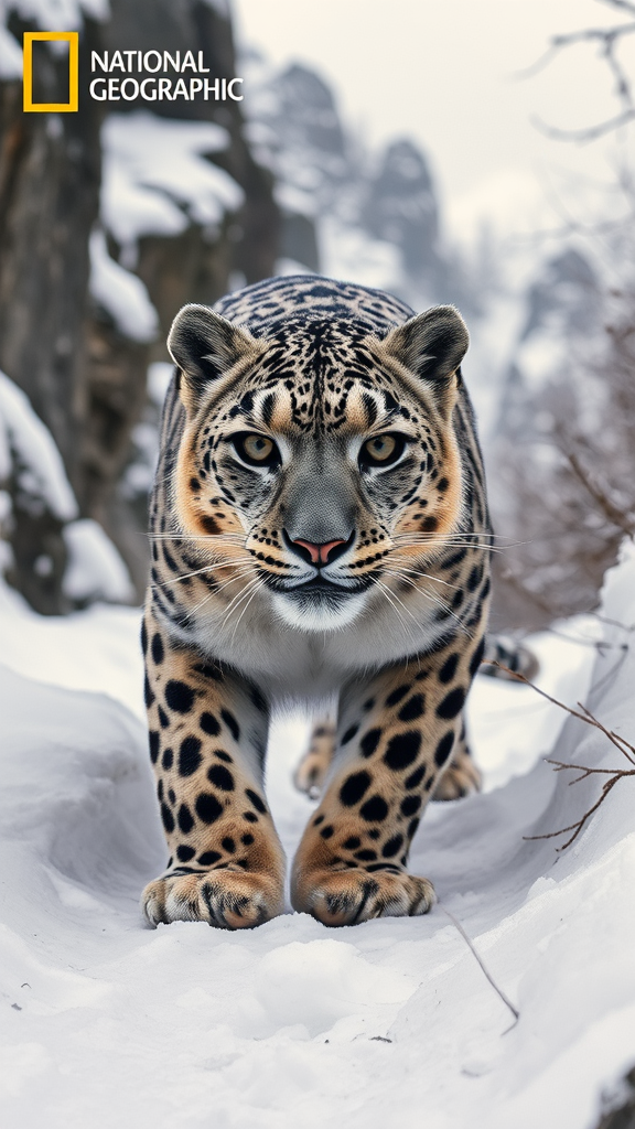 An award-winning wildlife photograph from National Geographic captures a full-body view of a snow leopard stealthily prowling through a snowy, rocky mountain forest on an overcast day. The scene is blanketed in snow, highlighting the leopard’s thick, spotted fur. Its sharp, intense gaze meets the viewer, the hyper-detailed eyes conveying a predatory focus. The image is in high resolution, with every whisker and flake of snow in crisp focus, bathed in soft, natural light that enhances the serene yet powerful atmosphere of this majestic creature in its natural habitat.