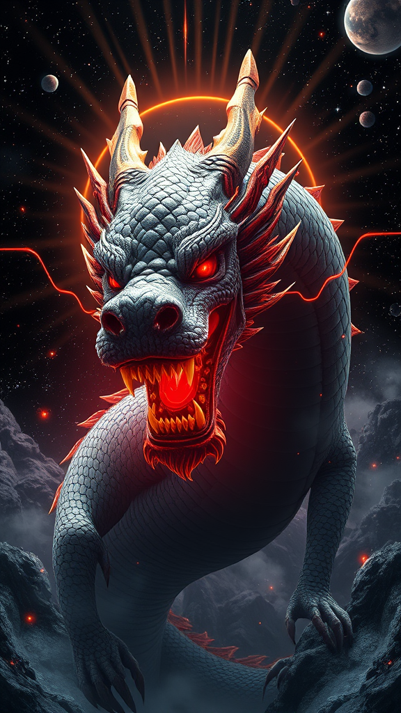 An awe-inspiring ancient Chinese space dragon, formidable and regal, navigates the vastness of the cosmos with a commanding presence reminiscent of Balerion the Dread - the ultimate dragon deity. With piercing crimson eyes filled with bloodlust and armored in lustrous gray scales, it dominates the scene. The full-body portrait is set against a starry, cosmic tapestry, bursting with ornately vibrant colors inspired by Ross Tran's artistry. The landscape echoes Brian Froud’s style, captured in digital art of insane detail, as it trends on art platforms. The symmetrical design emphasizes its razor-sharp teeth in sharp focus, while a dusty black halo serves as its celestial backdrop. Radiant light casts god rays across the composition, enveloped in a dark, fantasy atmosphere that is both macabre and otherworldly. This environmental spectacle stretches across an ultra-wide shot, rendered with hyper-realistic detail in a darkly enchanting realm akin to creations from Unreal Engine.