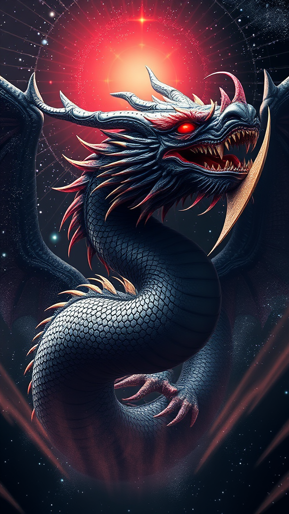 An awe-inspiring and magnificent ancient Chinese celestial dragon majestically soaring through the cosmos, embodying the mighty aura of Balerion the Dread, the ultimate dragon deity. Its crimson red eyes burn with an intense bloodlust, while its slate-gray scales shimmer under the expanse of the universe. A full-body view portrait showcases the dragon's grand design against a starry, cosmic backdrop, adorned with intricate and vibrant colors reminiscent of Ross Tran's artwork. The landscape evokes the mystical touch of Brian Froud, offering an intricately detailed digital masterpiece trending on Art Station. The dragon's symmetrical form is striking, with sharp teeth and a razor-sharp focus on key visuals. A dusty, enigmatic black halo frames the scene, while radiant light pours in, creating god rays that enhance the dark fantasy atmosphere. The artwork is rich with macabre elegance, capturing an environmental essence in an ultra-wide shot that's hyper-realistic, reflecting the sophistication of an Unreal Engine creation.