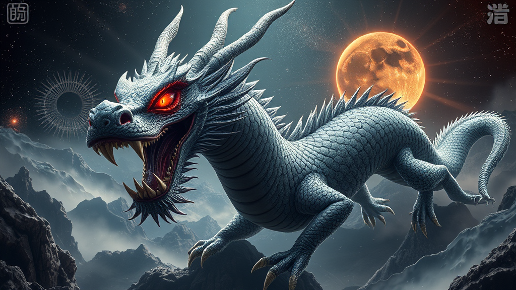 An awe-inspiring and magnificent ancient Chinese space dragon roaming the universe, reminiscent of Balerion the Dread, the ultimate dragon deity, with intense crimson eyes and a thirst for blood, adorned in gray scales. A full-body portrait reveals its grandeur against a starry and cosmic backdrop, enriched with ornate and vibrant colors, in the style of Ross Tran. Imagine a landscape crafted by Brian Froud in digital art, featuring insane detail and trending on ArtStation. The image is symmetrical, highlighting sharp teeth and capturing key visuals in sharp focus, with a dusty, ethereal black halo in the background. Bathed in radiant light, the scene exudes a dark fantasy aura with god rays, enveloping the viewer in an atmospheric, macabre, yet enchanted environment. It's an ultra-wide shot, with the dragon pictured in insanely detailed, hyperrealistic render, as if created in Unreal Engine, evoking the mystique of a true dark fantasy landscape.