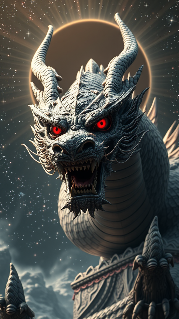An awe-inspiring and magnificent ancient Chinese space dragon roams the universe, embodying the formidable presence of Balerion the Dread, the unparalleled dragon deity. With crimson red eyes exuding an intense bloodlust, it boasts imposing gray scales highlighted by intricate patterns. A full-body view reveals this celestial being against a starry, cosmic landscape. Its ornate features are brought to life with vibrant colors, reminiscences of an artwork by Ross Tran, and a landscape touch reminiscent of Brian Froud. The digital art is insanely detailed, gaining traction on platforms like ArtStation. The symmetrical form showcases sharp teeth in sharp focus, with key visuals including a mysterious black halo in the background. Radiant light teems with atmospheric god rays, casting an eerie, macabre tone fitting for dark fantasy. This ultra-wide shot captures a hyperrealistic portrayal with an environmental grandeur, as if crafted within Unreal Engine, presenting an otherworldly experience.