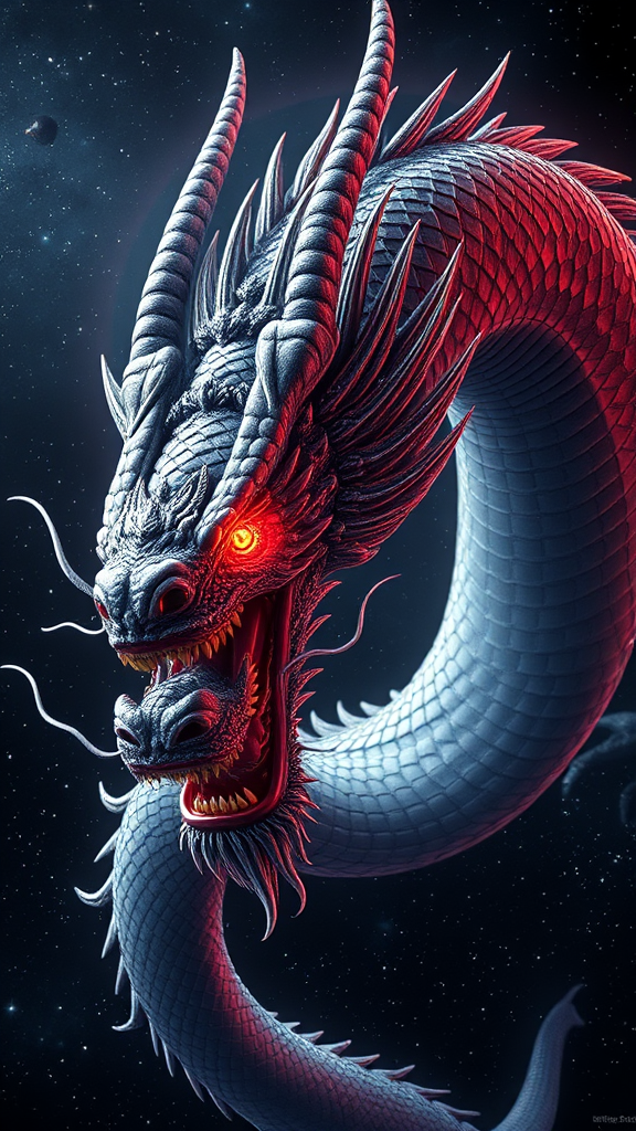 An awe-inspiring and majestic ancient Chinese space dragon, with the commanding presence of Balerion the Dread, glides through the depths of the cosmos. Exhibiting the essence of a mighty dragon god, its eyes burn with a fierce crimson intensity, radiating bloodlust. The dragon's gray scales shimmer with an intricate beauty, reflecting the starlit expanse around it. Its full-bodied form stands out against the cosmic backdrop, adorned with vibrant colors and ornate details. This digital artwork, influenced by the styles of Ross Tran and Brian Froud, surges with detail, capturing the trending essence of Art Station's finest. The dragon's symmetrical majesty is highlighted by razor-sharp teeth and a sharp focus, framed by a dark, dusty halo. Celestial god rays pierce the darkness, adding radiant illumination to this macabre, dark fantasy. The environmental atmosphere is enhanced by an ultra-wide perspective that blends hyperrealistic elements with the surreal touch of Unreal Engine, entrancing viewers with its depth and complexity.