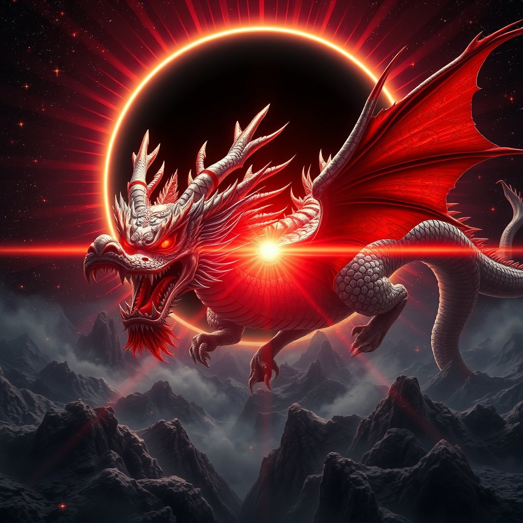 An awe-inspiring and majestic ancient Chinese space dragon, reminiscent of Balerion the Dread, prowls the universe. This true dragon deity exudes power with its crimson red eyes radiating bloodlust and formidable, grey scales. Captured in a full-body view portrait, it majestically traverses a starry, cosmically rich backdrop. The dragon's ornately detailed form bursts with vibrant colors, echoing the artistry of Ross Tran, set against landscapes evocative of Brian Froud's works. Rendered in digital art with insane detail, the piece trends on Art Station and exhibits a symmetrical composition with razor-sharp teeth and focus. A mysterious black halo enhances the background's celestial depth. Glowing with radiant light amidst an atmospheric dark fantasy setting, god rays pierce through the scene, imbuing it with a macabre yet captivating aura. The environment displays an ultra-wide shot, hyper-realistic in nature as if born from Unreal Engine, capturing the dragon's mystique in a format inspiring awe and wonder.