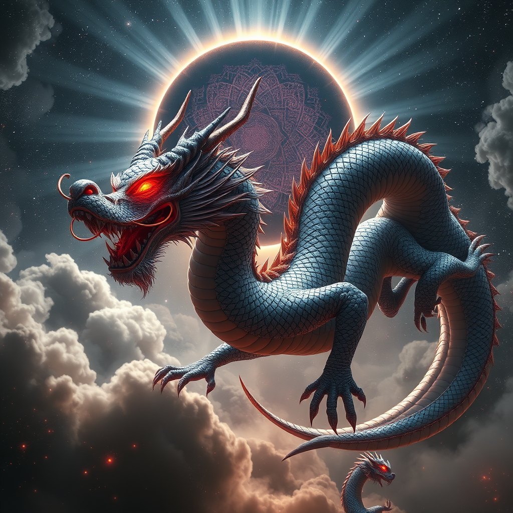 An awe-inspiring and majestic ancient Chinese space dragon glides through the cosmos, its form reminiscent of Balerion the Dread, embodying the essence of the true dragon deity. Its eyes glow with a fierce crimson hue, conveying an insatiable bloodlust. The dragon's scales shimmer in shades of gray, covering its entire imposing physique. This digital art piece reveals a panoramic full-body view set against a starry, cosmic backdrop, adorned with vibrant and intricate colors reflecting the artistic styles of Ross Tran and Brian Froud. This composition is trending on ArtStation, showcasing a symmetrical design with razor-sharp teeth and an unparalleled focus on detail. A mysterious black halo hovers behind, amidst the dusty, ethereal atmosphere. Radiant beams of light pierce through, creating a dark fantasy ambiance enriched with god rays. Facets of the macabre emerge from the environment as the scene unfolds in an ultra-wide shot, hyperrealistically rendered with the power of Unreal Engine.