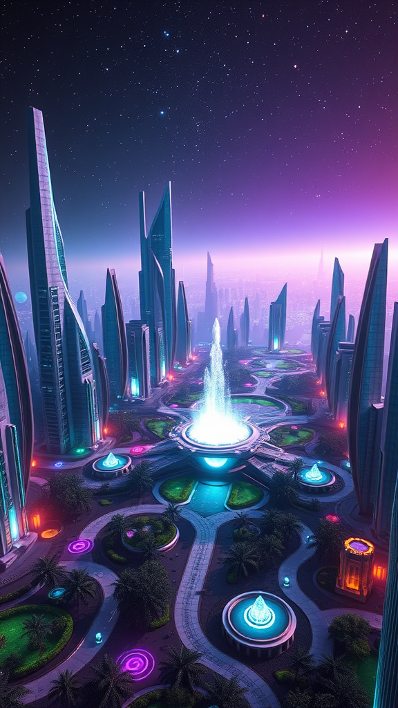 An awe-inspiring digital image of a futuristic cityscape that highlights the advanced design and technology of an alien civilization, crafted in a highly detailed, cinematic style, and trending on Artstation. This city is filled with towering buildings, each boasting its own unique shape and shimmering facade composed of groundbreaking materials. The lighting is dynamic, with vivid hues of teal and violet that electrify the skyline. Holographic fountains float in mid-air, surrounded by verdant gardens and ultra-modern sculptures. In the background lies a vast expanse of space, stars, and planets twinkling softly, providing a stunning contrast between the city's organic beauty and the endless universe. This epic, exciting image captures a moody celestial atmosphere with soft lighting, employing HDRI for enhanced realism. Demonstrating the pinnacle of professionalism, the image utilizes industry-leading tools from Zeiss, Hasselblad, Fujifilm, Arriflex, IMAX, and is available in resolutions up to 8k. The hyper-realistic scene features lens flares and evokes a vibe akin to matte painting or concept art, with a soft render and detailed architectural elements, aligning with the high standards of CGSociety and Octane Render. Overall, this image represents a brilliant piece of digital art, intricately detailed, inspiring, and fitting for a magazine feature or as a premier high-quality wallpaper.